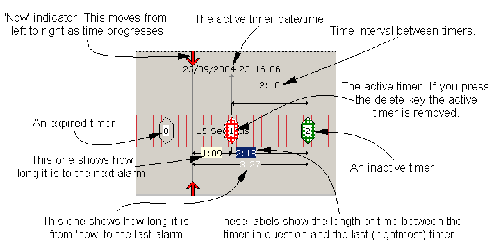 4)Move the other timers using either the interval, the actual time as shown on the active timer date/time or as shown 'from now' below the timer for guidance. If you want to move all the timers to the right of the active one by the same amount, hold the shift key down as you do the move. see Moving timers for ways of moving timers using the keyboard.